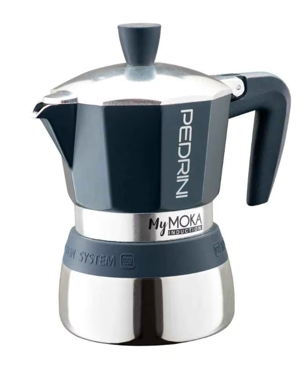 Caffettiera Mymoka Induction Pedrini con caldaia bimetallica brevettata, adatta a tutti i piani cottura, inclusa l’induzione.