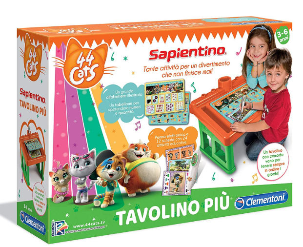 Tavolino più 44 Gatti Clementoni un fantastico tavolino con vano porta-oggetti, per divertirsi e imparare con le schede e la penna elettronica interattiva.Contiene 12 schede con 24 attività educative, una penna elettronica svela-risposte, un grande alfabetiere illustrativo, un maxi tabellone per giocare con numeri e quantità .