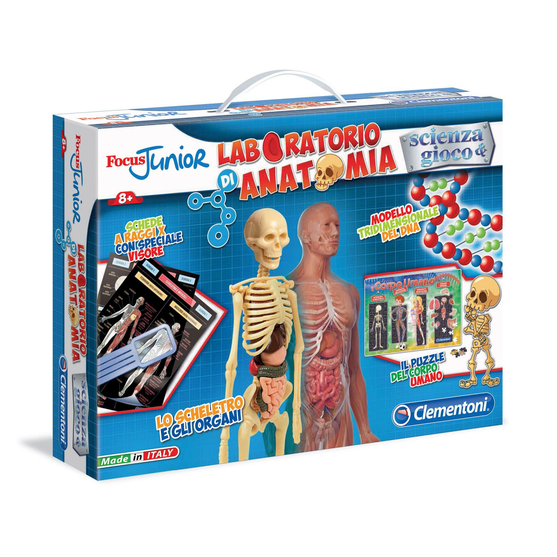Con un pratico porta schede e un visore per studiare gli organi e gli apparati. Contiene: una molecola 3D del DNA, organi e scheletro del corpo umano da assemblare, porta scheletro, tavolo d'anatomia, schede trasparenti, visore, puzzle.